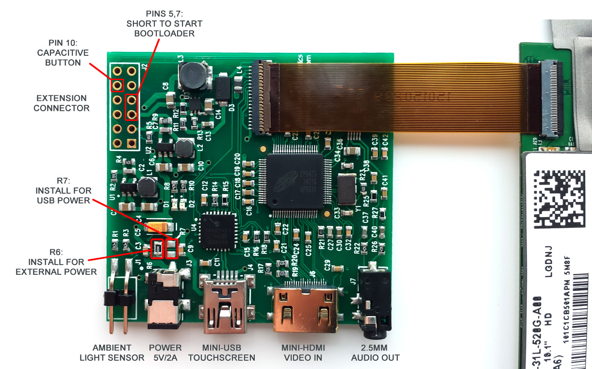 LCD with control electronics takes around 1.2A current when backlight is set to maximum value, and it can be powered either by external power supply (5V/2A, jack is OD=2.6mm, ID=0.65mm, positive central pin) or by USB. Power mode is selected by installing one of 0R resistor – R6 for normal power supply or R7 for USB power. CAUTION! Do not install both resistors at once, because this can damage USB port on your computer.