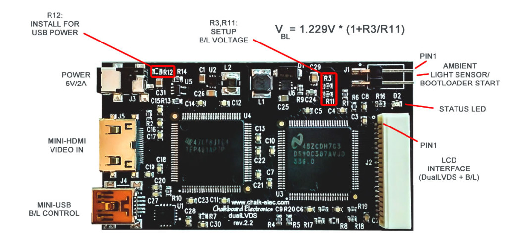Converter has on-board configurable backlight voltage generator that can deliver up to 35V/1A. Backlight voltage can be set with R3, R11 resistors (see above picture for formula). We supply boards with default 24V backlight voltage. Take note that R11 should be in 5K – 20K range. If LCD backlight takes more than 3W, then U6 and L1 inductor can have temperature up to 100C degree. In this case you should use additional heat sink to avoid overheating.