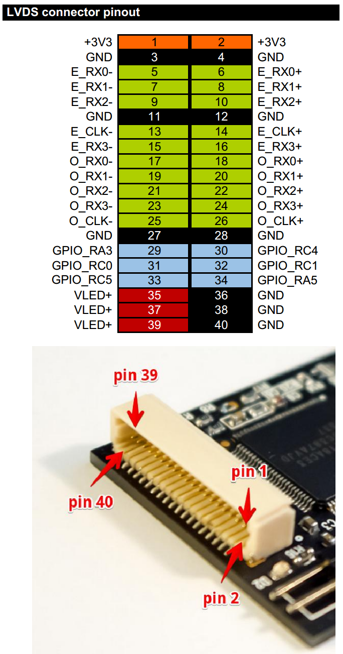 If you buy standalone board, then you will need to make your own LVDS cable for your LCD panel. We supply mate housing connector and 50 pcs of pin terminals together with board, they can be crimped to cable wires with AWG #32 crimp tool. We recommend using PA-09 crimp pliers, it has affordable price and provides high quality results. Below is pinout of LVDS connector, PDF version is available here: dualLVDS board pinout.